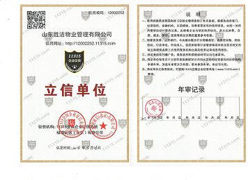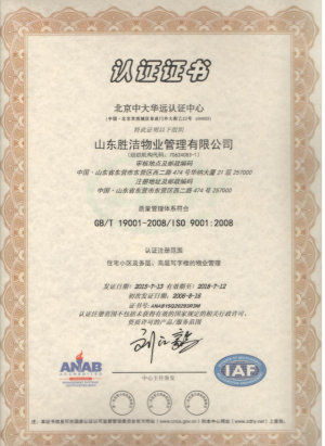 山東勝潔物業管理有限公司于2012年通過ISO9001質量管理體系認證,將質量管理體系引進日常服務管理工作中。公司建立了完善的質量管理制度,如質量管理責任制、質量管理制度、工作流程、品質考核等內容,明確了各崗位及各層級人員的崗位職責,規范了員工的行為和工作標準。根據ISO9000質量管理體系標準要求,公司還建立了系統、規范的質量管理體系文件,如管理手冊、作業性文件等,保證了質量管理體系的持續有效運行。公司多次獲得國家級、省級、市級守合同重信用企業榮譽。