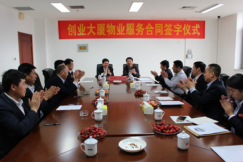 然后,在創業大廈會議室舉行簽約儀式,勝潔集團董事長羅軍三與臨朐縣事務管理局馬局長分別在項目合同書上簽字,標志著雙方將再度攜手,共同為創業大廈的物業管理與服務保障工作再創新的佳績。