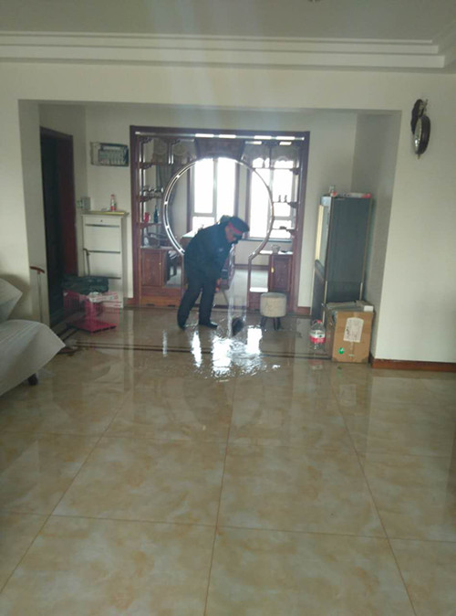 1月28日勝潔集團項目部悅來山水居業(yè)主家跑水,物業(yè)人員得知消息后立即幫助業(yè)主清理現(xiàn)場