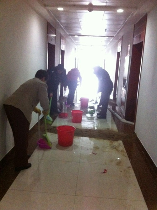 勝潔集團項目部金融大廈消防跑水,物業(yè)人員清理現(xiàn)場