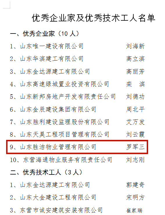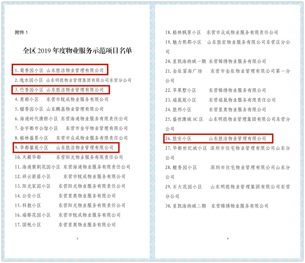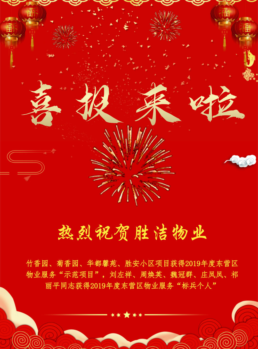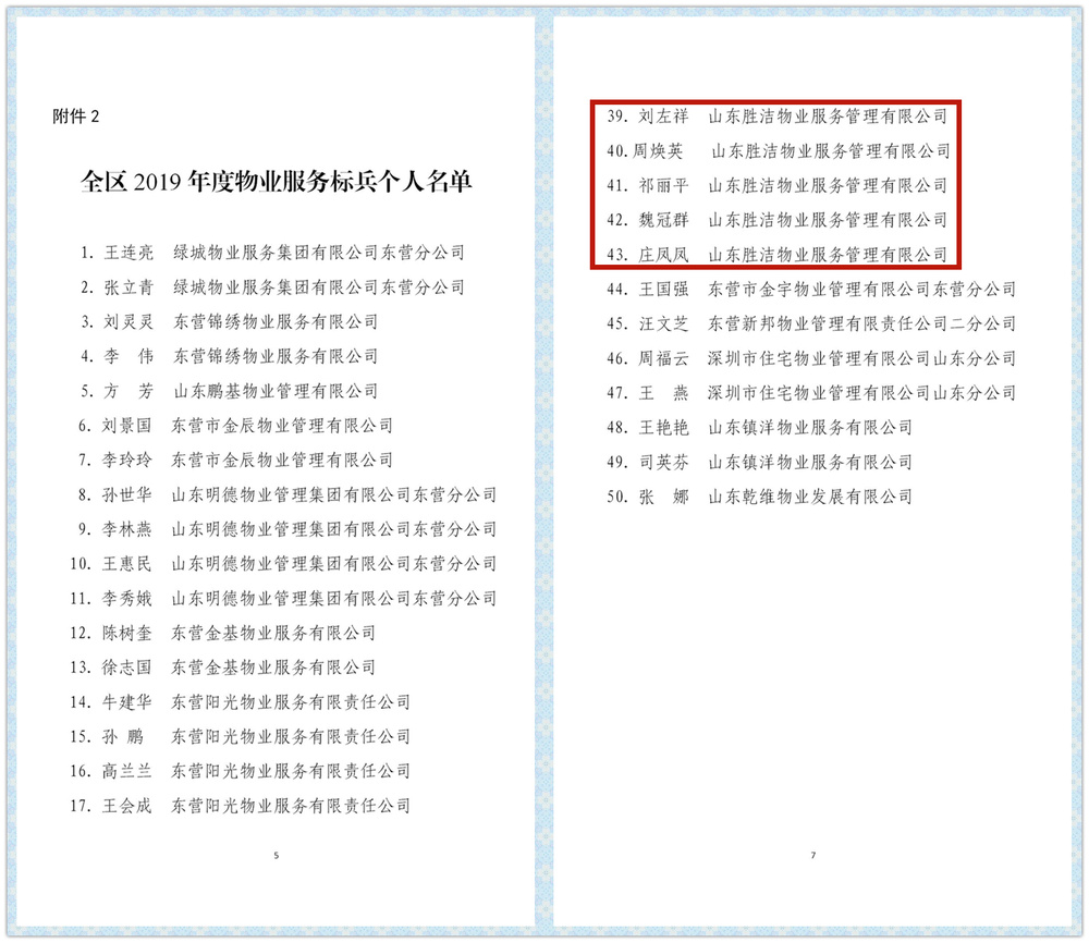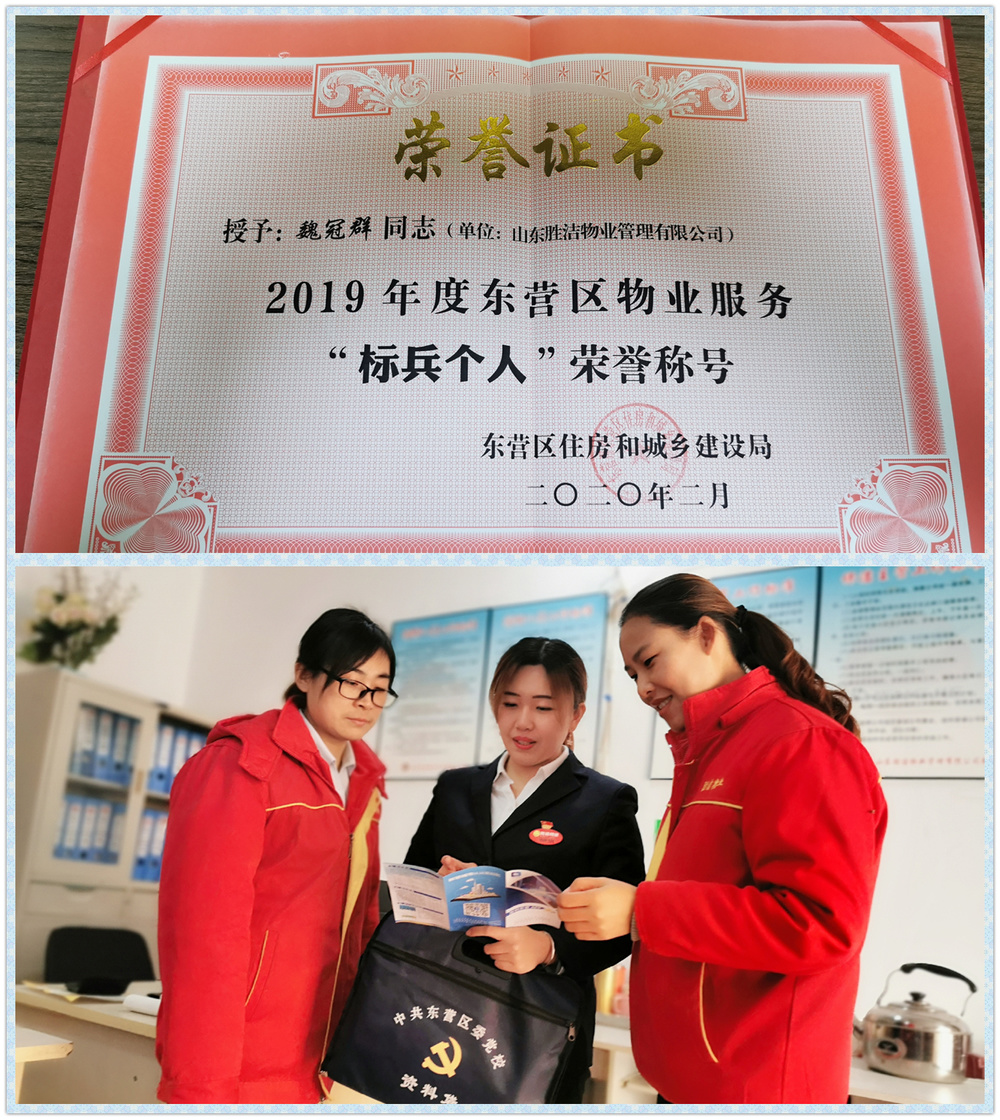 2020年7月10日下午,東營區“紅色物業”建設暨物業管理提升工作推進會議在區委黨校三樓會議室召開。會議通報了2019年物業服務示范項目和標兵個人,安排部署了2020年全區“紅色物業”建設及物業管理重點工作任務。勝潔物業董事長羅軍三被評為東營區優秀企業家。 勝潔物業菊香園、竹香園、華都馨苑和勝安小區項目被評為2019年度東營區物業服務“示范項目”。勝潔物業劉左祥、周煥英、魏冠群、莊鳳鳳、祁麗平被評為2019年度東營區物業服務“標兵個人”。 勝潔物業2019年度東營區物業服務“標兵個人”——劉左祥(右一)。 勝潔物業2019年度東營區物業服務“標兵個人”——周煥英。 勝潔物業2019年度東營區物業服務“標兵個人”——魏冠群(左二)。 勝潔物業2019年度東營區物業服務“標兵個人”——莊鳳鳳(左二)。 勝潔物業2019年度東營區物業服務“標兵個人”——祁麗平(左二)。 勝潔物業人將珍惜榮譽,繼續前行,不斷提升物業服務品質,并通過有溫度,有感情的物業服務,真正使“紅色物業”、“智慧物業”有色彩,有活力,有溫暖,為廣大業主提供更加優質的服務!