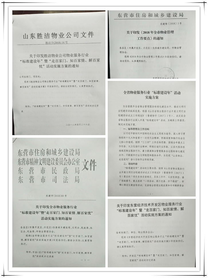 項目經理王海濤傳達了《2018年全市物業管理工作要點》的通知并宣讀了《全省物業服務行業“標準建設年”活動實施方案》、東營市住房和城鄉建設局下發的重要文件及勝潔物業關于物業服務行業“標準建設年”暨“走百家門、知百家情、解百家憂”活動實施方案的通知等文件的精神。