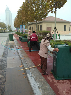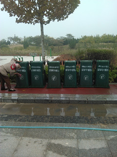 悅來山水居項(xiàng)目處工作人員清洗垃圾桶,使小區(qū)內(nèi)衛(wèi)生更加整潔