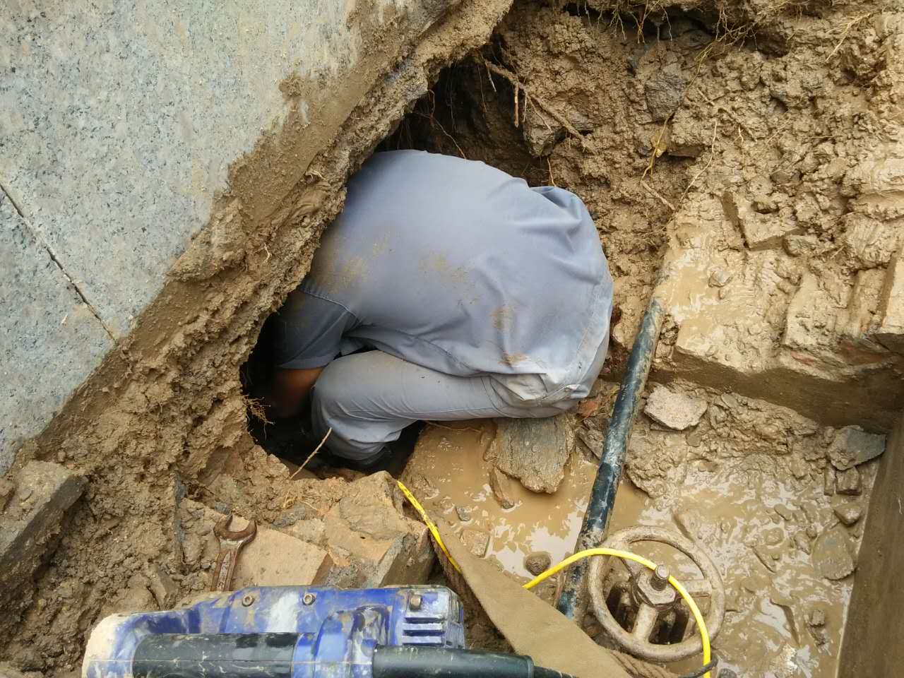 山東勝潔物業集團金盾管理項目處水管線破裂,及時聯系供水公司進行搶修。(以下為搶修現場圖),公司項目處工程人員積極配合施工。